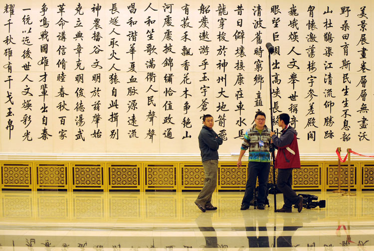3月6日,幾名記者在北京人民大會堂金色大廳《中華頌》前等候采訪。 兩會期間的人民大會堂內,磅礴大氣的書畫作品映襯著媒體工作者身影的鏡頭隨處可見,不僅賞心悅目,也讓記者們在緊張的工作之余心情得到放松和舒緩。 新華社記者 李紫恒 攝