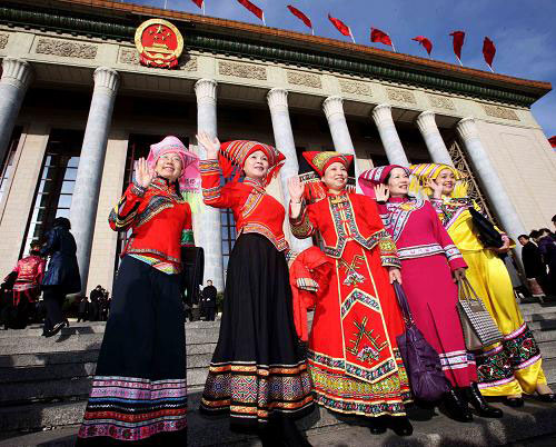 3月5日,第十一屆全國人民代表大會第三次會議在北京人民大會堂開幕。這是幾位全國人大代表抵達天安門廣場。