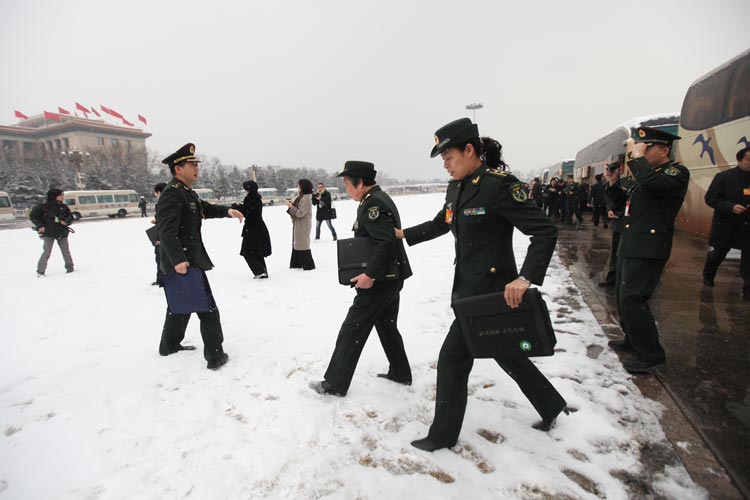 3月8日,中國人民解放軍總參謀部的代表踏雪趕往會場。