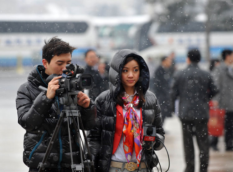 3月8日,一場春雪降臨北京,兩名記者在天安門廣場冒雪采訪。