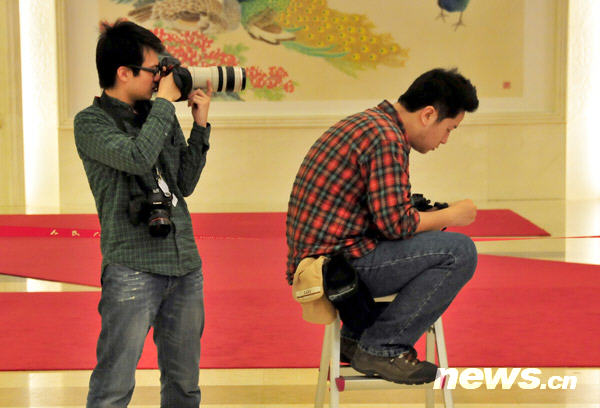 3月7日,十一屆全國人大三次會議和全國政協十一屆三次會議繼續進行,各路攝影記者齊集人民大會堂,展示自己的“百變”身姿。圖為攝影記者在新聞發布會現場。新華網 孫巍 攝