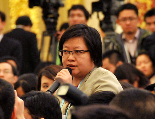 3月14日10時,溫家寶總理在人民大會堂三樓金色大廳與中外記者見面并答問。圖為新加坡《聯合早報》記者提問。翟子赫 攝