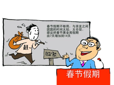 前日,來自北京的全國政協委員陶化成在提交兩會的提案中提出,把春節假日由7天增加到14天。陶化成認為,對于回家探親者(每年春節成億計)7天假太短,大部分時間要在路上度過,假日過得太緊張、匆忙,而且現在很多單位的工作靠農民工支撐,按照傳統習慣,農民工通常過了正月十五才進城找工作。
