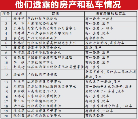 江蘇鹽城市市長李強介紹自己有兩套房。廣西欽州市委書記湯世保說:“我在老家有一套房子,在目前的工作地有一套房子。”