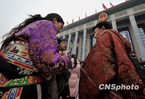 來自西藏高原的記者們3月初盛裝出現(xiàn)在北京人民大會堂,準備展開今年人大、政協(xié)“兩會”的新聞報道。中新社發(fā) 賈國榮 攝
