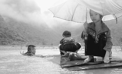 回眸:一片澤國,雨仍在下,兩個孩子或蹲或趴在一塊木板上,一名男子被洪水淹沒了肩膀,卻仍奮力地把木板拉向彼岸……
