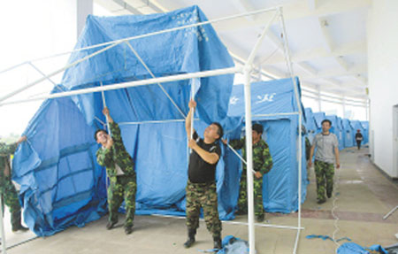 當?shù)孛癖鴳毙》株犠ゾo時間搭建帳篷,安置受災群眾。
