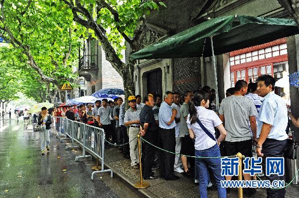 6月27日,游客排隊參觀中共一大會址紀念館!捌咭弧奔磳⒌絹恚虾V泄惨淮髸芳o念館游人如織。新華社發(郭長耀 攝)