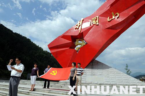 6月30日,江西省井岡山市廈坪鎮(zhèn)基層黨員干部在井岡紅旗雕塑下宣誓,重溫入黨誓詞。“七一”來臨之際,前來江西井岡山祭奠革命先烈的黨員干部絡繹不絕。他們重溫入黨誓詞,學習井岡山精神,迎接黨的89歲生日。新華社記者 馬平攝