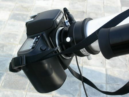 2)、直焦法相對來說麻煩一些。要用這種方法必須使用數碼單反相機,這種相機的鏡頭可以拆卸,將其拆掉后,再把望遠鏡的目鏡拿掉,然后將數碼單反的機身和望遠鏡的主鏡通過轉接環接到一起,這就相當于用望遠鏡直接當相機的鏡頭。這種方法的好處是經過的光學系統最少最簡單,因此能保證質量最好的成像——雖然這樣得到的圖像不如放大法的大。直焦法最關鍵的裝置就是連接相機和望遠鏡的接環。這種接環在天文器材專營店可以買到,不過要注意相機的品牌,不同品牌的數碼單反其接口型號是不一樣的;也要注意望遠鏡目鏡端口多大,一般而言目前常見的目鏡端接口的大小是1.25英寸,也有一些好點的望遠鏡使用2英寸的大接口,而比較老型號的小望遠鏡其接口可能是1英寸的小接口。