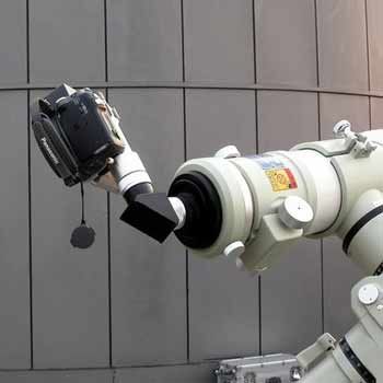 如果想借助望遠(yuǎn)鏡拍攝日食過程的視頻,也是很簡單的一件事。由于家用攝像機(jī)的鏡頭一般都是不可拆卸的,因此我們只能用類似照相觀測時的放大法來拍攝,具體方法請參考前面的“照相觀測”一節(jié)。而且由于視頻拍攝的是連續(xù)畫面,因此對于很多方面的要求(比如攝像機(jī)鏡頭和目鏡的同軸程度)還沒有照相觀測那么高。