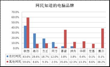 另外,關于電腦品牌認知度和購買度的調查,我們發現農村網民知道最多和最愿意購買的電腦品牌都是聯想,其次是海爾。方正、同方等品牌也被部分農村網民所認知,而知道惠普、華碩、戴爾等國外品牌的比較少。