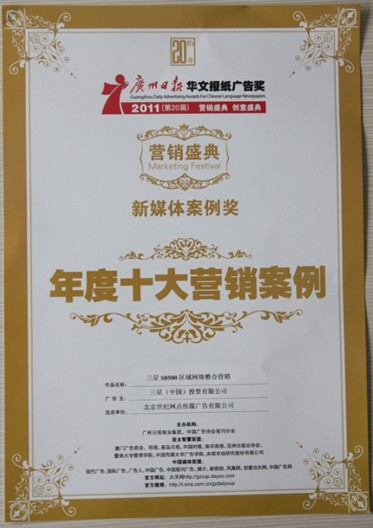 第20屆廣州日報華文報紙廣告獎隆重揭曉,作為區域網絡整合營銷的先行軍和領跑者,世紀網點選送的北京現代和三星S8500兩大品牌案例雙雙榮膺“年度十大營銷案例”獎。