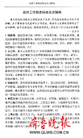 代表們手中拿的這份名詞解釋,4頁紙共3500余字,包括物聯(lián)網(wǎng)、云計算、低碳經(jīng)濟、碳纖維、陶瓷纖維、離子膜等科技名詞,共25條。每條解釋后面還標(biāo)注了該詞所在政府報告的頁碼。