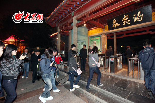 大眾網濟南10月21日訊 (記者 吳哲 韋輝)今天下午,“亞太森博杯”聚焦山東半島藍色經濟區——第六屆中國網絡媒體山東行采訪團近50家網絡媒體的記者陸續到達濟南。晚上8時,采訪團成員趁著夜色走進趵突泉公園,爭睹“趵突騰空”、“ 水涌若輪”的動人景色,感嘆濟南泉水保護得力。 今天晚上8時許,近80名采訪團成員來到了濟南市趵突泉公園,一邊聽著導游的詳細講解,一邊興致勃勃地觀賞“趵突騰空”的迷人美景。“趵突泉真是太美了!”來自大江網的記者吳麗輝一邊用相機定格這一美麗瞬間一邊說,她說自己之前只是在小學課本上看到過關于趵突泉的描寫,今天第一次來到濟南,走進趵突泉公園,近距離和泉水接觸,感覺相當不錯。 “呀,真甜!”來自膠東在線的記者魏琪走到柳絮泉前,捧起了一捧泉水送到嘴邊品嘗了一下,驚呼起來。魏琪說,雖然自己不是第一次到濟南了,但是夜游趵突泉還是頭一遭。雖然自己一直在煙臺工作,但是很關注省城濟南的新聞,知道濟南因為地下水位過低導致趵突泉一度停涌,但是今天親眼目睹了趵突 泉撒歡似的噴涌,一下就打消了自己的擔憂。他表示,濟南地下水位沖破30年來的新高和濟南市得力的保泉舉措密不可分。 在趵突泉三股水旁,閃光燈在夜色中頻頻閃爍,記者們用“長槍短炮”把濟南的泉水頃刻定格。