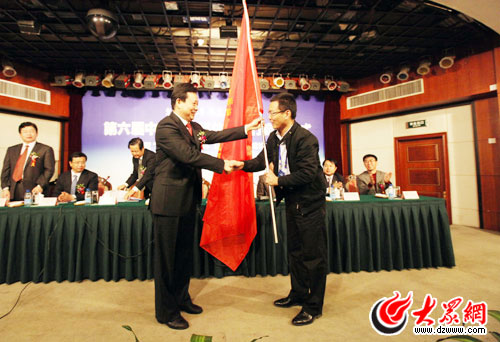 中共山東省委常委、宣傳部長李群向采訪團代表人民網記者張巖授旗