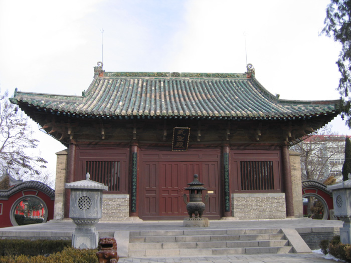 該殿坐北面南,其座月臺磚石砌筑,寬12.9米,長18.3米,高1.12米。殿面寬3間、12.63米,深三間、10.75米,殿身高10.39米,建筑形式為單檐歇山,綠琉璃瓦頂。這座大殿保持了宋代建筑特有的風格,系研究我國中古時期木構建筑的珍貴資料。建國后此大殿維修過兩次,為省級重點文物保護單位。