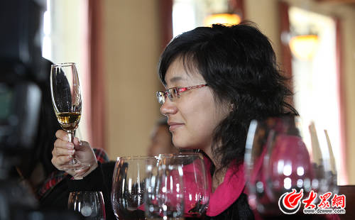 采訪團(tuán)美女記者參觀訪問張?jiān)H葡萄酒城,感受品酒的高貴與樂趣,親身體驗(yàn)煙臺(tái)張?jiān)>莆幕臐庥魵庀。大眾網(wǎng)記者 曹亮 攝