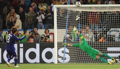 6月29日,日本隊球員駒野友一(左)射失點球瞬間。當日,在茨瓦內舉行的2010年南非世界杯八分之一決賽中,日本隊經過點球大戰,以3比5負于巴拉圭隊,無緣八強。新華社記者李尕攝