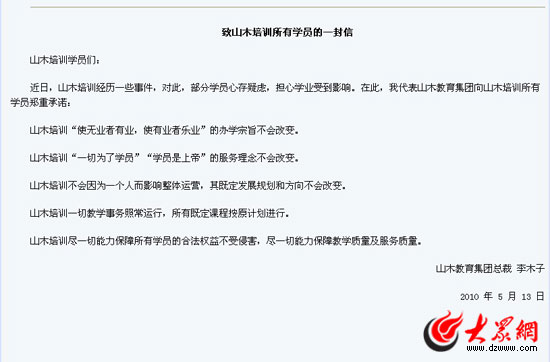 山木教育集團(tuán)新總裁李木子在其官方網(wǎng)站發(fā)布公開信。