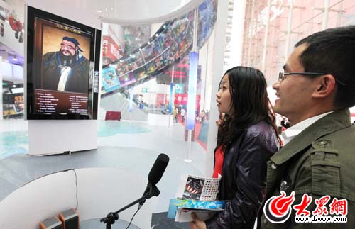 文博會展覽大廳能說會答得動態三維孔圣人吸引了眾多市民的駐足觀賞,不少觀眾競相與孔圣人對話,請圣人傳道解惑(大眾網記者 曹亮 攝)