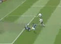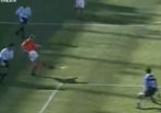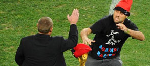 ▲大力神杯展示給了全場球迷后,等待球員入場,這時候,一位大膽的球迷突然沖入場內,球迷都以為他準備現場裸奔,沒想到這名不速之客竟直奔大力神杯而去!全場都驚呼一片。好在球場工作人員和保安眼疾手快,在這名球迷距金杯幾乎只有一個身位的地方(如圖),將其連拉帶拽按倒在地,然后帶離球場。世界杯決賽前,大力神杯險遭不測,好在這個意外并沒有影響到比賽進行。
