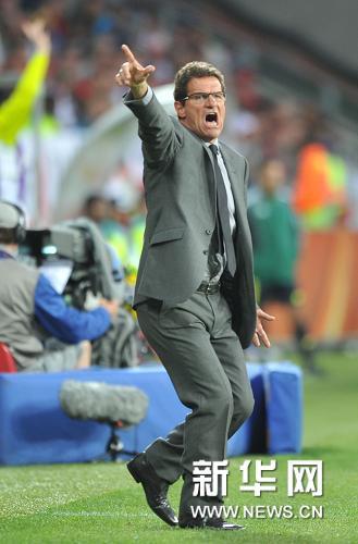6月23日,英格蘭隊主教練卡佩羅在場邊指揮。當日,在伊麗莎白港的曼德拉灣球場舉行的南非世界杯C組第三輪的比賽中,英格蘭隊1比0戰勝斯洛文尼亞隊。新華社記者楊磊攝