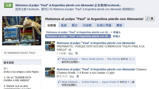 一個“如果阿根廷被德國淘汰,殺了章魚‘保羅’”的小組,在臉譜網上成為了阿根廷球迷們熱捧的對象。這個小組的名字,直接表明了球迷們的觀點。但這并不能簡單地表達阿根廷球迷們的憤怒,很多球迷們更是留言說要吃了章魚。