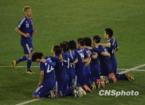 6月29日晚,南非世界杯1/8決賽第七場比賽在比勒陀利亞的洛夫托斯球場拉開戰幕,由巴拉圭隊迎戰日本隊。120分鐘比賽結束時,場上比分始終保持在0比0。在殘酷的點球大戰中,巴拉圭隊五罰全中,以5-3擊敗日本,挺進八強。圖為點球大戰中日本隊員集體下跪祈求上蒼。 中新社發 廖攀 攝