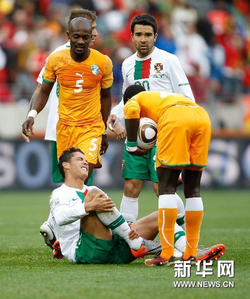 6月15日,葡萄牙隊球員克·羅納爾多(下)在比賽中倒地。當日,在伊麗莎白港曼德拉灣球場進行的2010年南非世界杯G組首輪比賽中,葡萄牙隊0比0戰(zhàn)平科特迪瓦隊。新華社記者廖宇杰攝