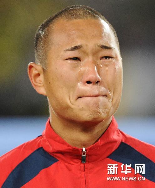 6月15日,朝鮮隊球員鄭大世在奏朝鮮國歌時淚流滿面。當日,在2010南非世界杯小組賽G組比賽中,朝鮮隊對陣巴西隊。 新華社記者李尕攝