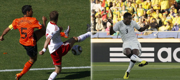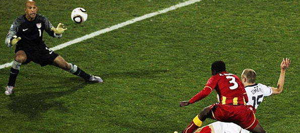北京時間6月23日22時(南非當?shù)貢r間16時),世界杯C組末輪在比勒陀利亞洛夫托斯球場展開1場較量,美國1比0擊敗阿爾及利亞,憑借進球數(shù)優(yōu)勢力壓英格蘭奪得頭名。開場不久,阿爾及利亞前鋒杰布爾射中橫梁。此后美國中場登普西射進一球,但被可疑地吹為越位。下半場,登普西射中門柱,多諾萬補時階段上演絕殺,頻臨淘汰的美國憑此球躍居小組首位。此后阿爾及利亞隊長葉海亞累計2張黃牌被罰下。圖為本場比賽精彩瞬間。