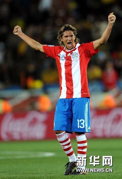 6月24日,巴拉圭隊(duì)球員貝拉在比賽結(jié)束后慶祝小組出線。當(dāng)日,在2010南非世界杯小組賽F組的比賽中,巴拉圭隊(duì)以0比0戰(zhàn)平新西蘭隊(duì),晉級(jí)16強(qiáng)。新華社記者李尕?cái)z