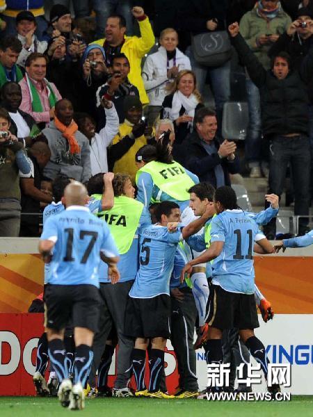 7月6日,烏拉圭隊(duì)球員迭·弗蘭(右二)進(jìn)球后慶祝。當(dāng)日,在開普敦綠點(diǎn)球場(chǎng)舉行的2010南非世界杯足球賽半決賽中,荷蘭隊(duì)3比2戰(zhàn)勝烏拉圭隊(duì)。新華社記者陳海通攝