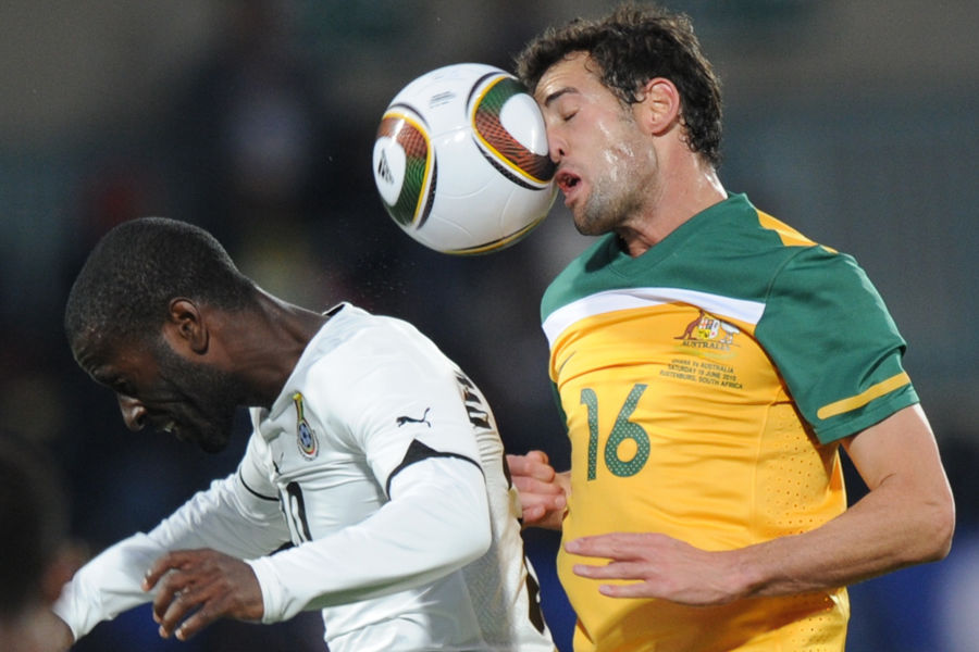 當地時間2010年6月19日,約翰內斯堡,澳大利亞終場球員瓦雷里與加納隊阿皮亞爭搶皮球。當天在皇家巴弗肯體育場,澳大利亞與加納隊戰成1-1平。