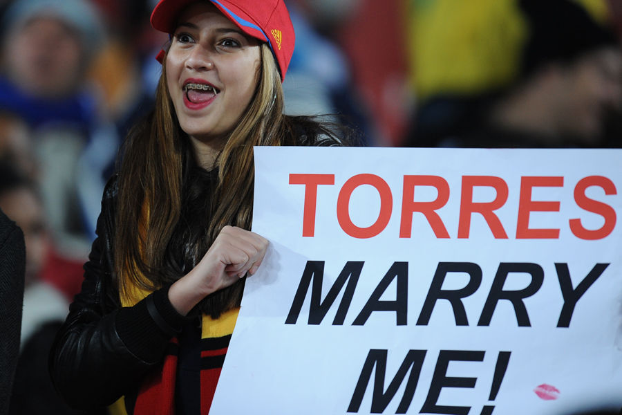 當(dāng)?shù)貢r間2010年6月21日,約翰內(nèi)斯堡,一名西班牙球迷高舉標(biāo)語向西班牙球員托雷斯示愛。當(dāng)天在埃利斯公園體育場,西班牙2-0戰(zhàn)勝洪都拉斯,托雷斯?fàn)顟B(tài)不佳,在第68分鐘被小將馬塔替換下場。