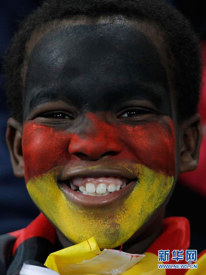 6月13日,一名德國隊球迷在比賽前。當日,在德班進行的2010年南非世界杯D組首輪比賽中,德國隊對陣澳大利亞隊。 新華社記者廖宇杰攝