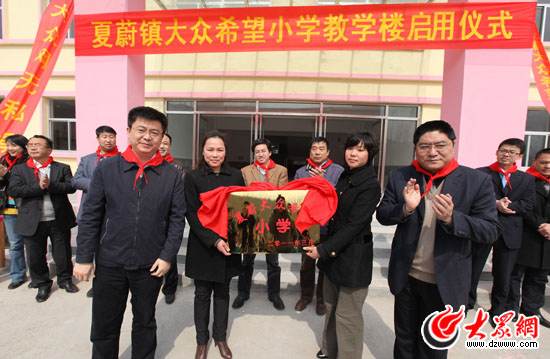 大眾報業集團社委、工會主席、黨群工作部主任耿春平,臨沂市團市委書記姜寧,大眾網總編輯朱德泉,大眾報業集團機關黨委副書記、團委書記馬洪,沂水縣委常委、紀委書記、宣傳部長吳恩坤等出席大眾希望小學啟用儀式,山東英才學院黨委書記、院長夏季亭代表愛心單位致辭,姜寧和朱德泉為學校揭牌,夏蔚鎮黨委書記李振現主持啟用儀式。