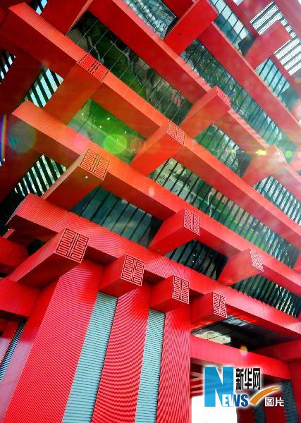 5月2日,中國國家館的中國紅在艷陽的映襯下顯得格外璀璨。新華社記者徐家軍攝