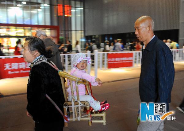 5月4日,兩位老人帶著孩子夜游世博園。新華社記者陳琪攝