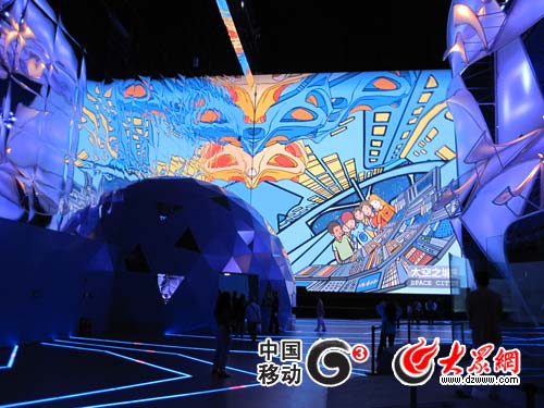 懷揣著對未來的遐想,游客們走進“城市和諧廣場”。記者在現(xiàn)場看到,展廳周圍環(huán)繞著500平方米超大可觸摸屏幕,正在播映一部宏大制作的“未來動畫電影”,使參觀者沉浸在它不可思議的想象中。西班牙INGENIAqed設計團隊負責人介紹說,他們與中國藝術家卜樺合作,將展廳打造成一個斑斕的夢想世界,帶領參觀者進入科幻電影中的夢幻城市。