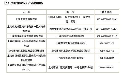 消費者要購買世博特許產(chǎn)品,可通過實體銷售和無店鋪銷售等多種渠道。其中:實體銷售有旗艦店(團購展示中心)、全品店(形象店)、專賣店、專柜(架)四種銷售網(wǎng)點;無店鋪銷售有網(wǎng)絡(luò)銷售和電視購物兩種銷售方式。目前,世博特許商品銷售點已經(jīng)遍及全國31個省市區(qū),銷售點總數(shù)突破4000家(包括貴金屬及普通商品的零售點),其中旗艦店(團購展示中心)7家,開設(shè)在上海市的有1000家。隨著世博會的臨近,特許產(chǎn)品經(jīng)營網(wǎng)點還將不斷增加。5月1日前,世博園區(qū)內(nèi)將有80個零售點開業(yè)。由于特許產(chǎn)品品類很多,每家商店不可能經(jīng)營所有產(chǎn)品,一般旗艦店(團購展示中心)的商品相對而言是最多的。旗艦店還帶有團購功能,需要團購的可與旗艦店進行接洽。