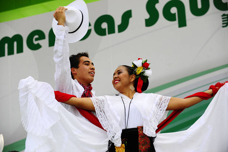 墨西哥“哈里斯科州舞蹈團”的演員在世博園內的美洲廣場為游客表演舞蹈。