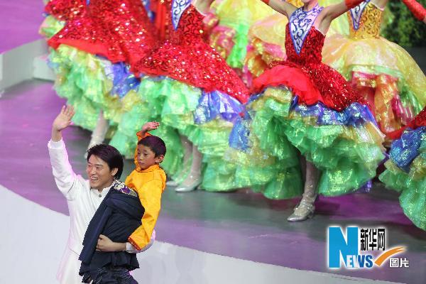 4月30日,中國2010年上海世博會開幕式文藝表演在上海世博園世博文化中心舉行。這是歌手抱起青海玉樹地震災(zāi)區(qū)的孤兒江巴才仁。新華社記者廖宇杰攝