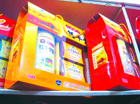 除了酒類,即墨副食品批發市場里營養品也很多,大多是浙江一家公司生產的冬蟲夏草營養液、高級西洋參含片、還有帶有贈品水壺的豆奶粉,一開始要價七八十元或上百元,聽說記者要大批量采購后,表示所有禮盒統統只要30元就行。