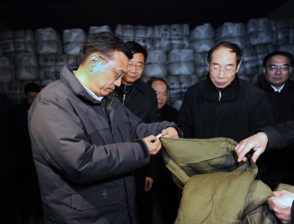 4月15日,正在遼寧考察工作的中共中央政治局常委、國(guó)務(wù)院副總理李克強(qiáng),在沈陽實(shí)地察看支援青海玉樹抗震救災(zāi)物資搶運(yùn)工作。這是李克強(qiáng)在民政部沈陽救災(zāi)物資儲(chǔ)備庫仔細(xì)察看棉衣棉被厚度和質(zhì)量。新華社記者 李濤 攝