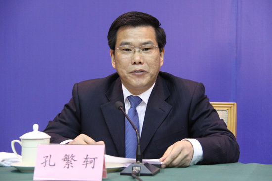 山東省人民政府新聞辦公室副主任、山東省新聞發(fā)布工作協(xié)調(diào)小組辦公室主任孔繁軻主持發(fā)布會(huì)