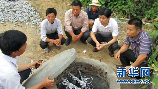 華容縣東山鎮黨委書記黃建明(右二)與群強村村支兩委負責人、村民一道制定打井方案(6月1日攝)。新華社記者 蘇曉洲 攝