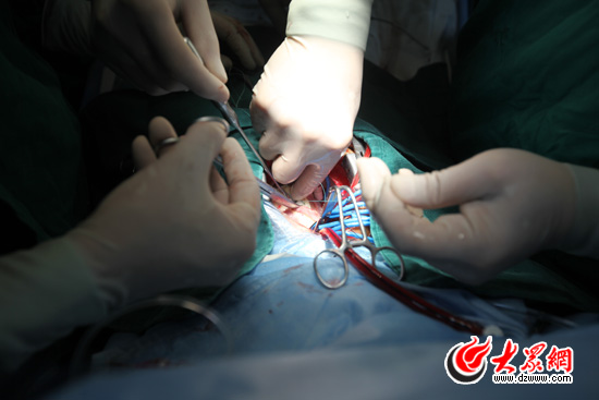 小永康的主刀醫(yī)生喬彬主任為小永康進(jìn)行室間隔缺損的修補(bǔ),記者看到,一種特殊材質(zhì)制作的直徑約1.5公分的修補(bǔ)物進(jìn)入心包外腔,手術(shù)臺(tái)上,醫(yī)生穿針引線,用一條條縫合線將修補(bǔ)物縫合。9點(diǎn)48分,成功修補(bǔ)室間隔缺損,停止體外循環(huán),開(kāi)始對(duì)小永康的主動(dòng)脈狹窄段進(jìn)行修補(bǔ)。