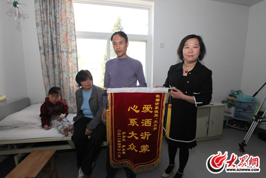 上午11時許,大眾網副總編輯姜長勇在小永康的病床前,代表大眾網、沂蒙晚報和廣大網友鄭重地將30077元現金交到小永康養父尹加元手里,祝福小永康手術順利、早日康復。接過三個厚厚的信封,尹加元夫妻倆感動地不知說什么好,妻子季成美激動地撲通一聲跪了下來。為了表達全家的謝意,尹加元一家為大眾網和沂蒙晚報分別制作了一面錦旗。他把寫有“心系大眾,愛灑沂蒙”的錦旗送到了大眾網副總編姜長勇手中,把感謝沂蒙晚報的錦旗送到了大眾網總編助理、采訪中心主任李冉手中,由她代為轉交沂蒙晚報。